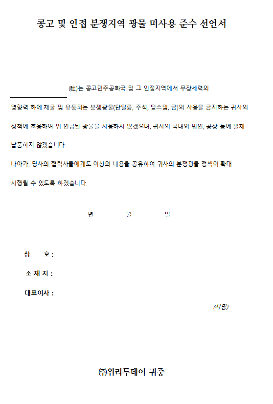 기업은 CMRT / EMRT를 근거로 「분쟁광물 미사용 선언서」 또는 책임 있는 광물 조달 선언을 제출할 수 있습니다. 단, 선언 시 다음 조건이 충족되어야 합니다.